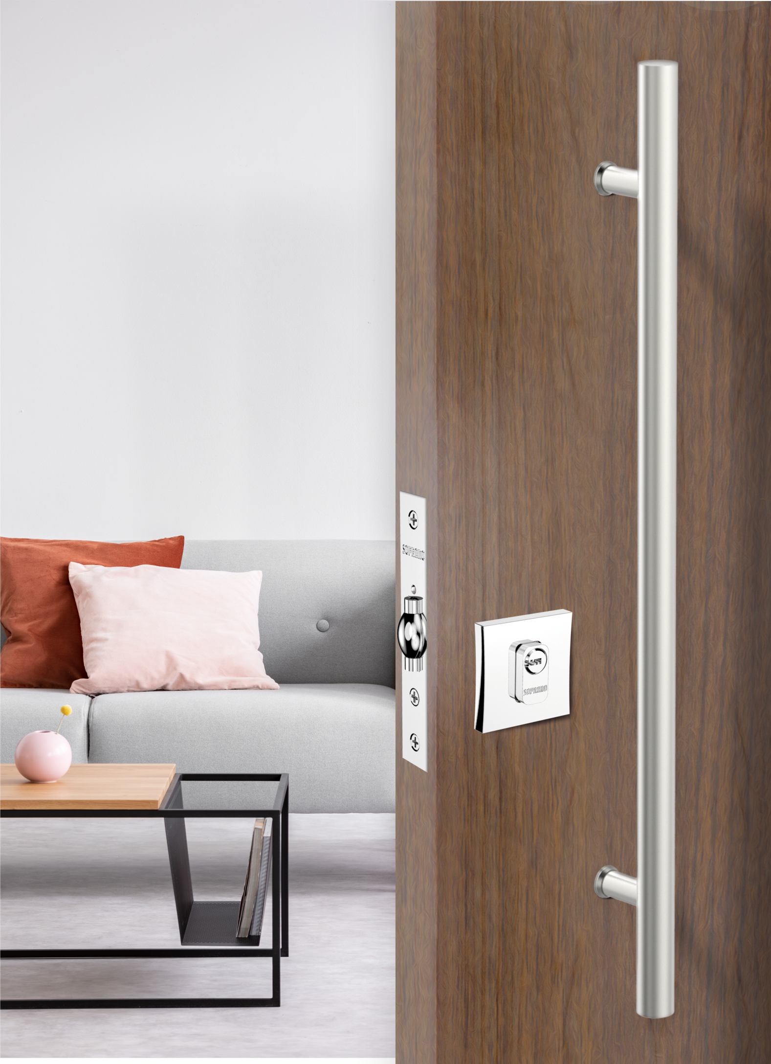 O produto é destinado especialmente para portas de entrada do modelo pivotante, sendo combinado a grandes puxadores para facilitar a abertura e o fechamento da porta.