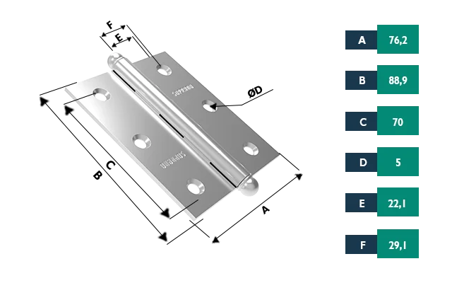 BT-DOBRADICA MEDIA 3.1/2X3 CROM S/ANEL RETO PINO BOLA 03005.0160.01
