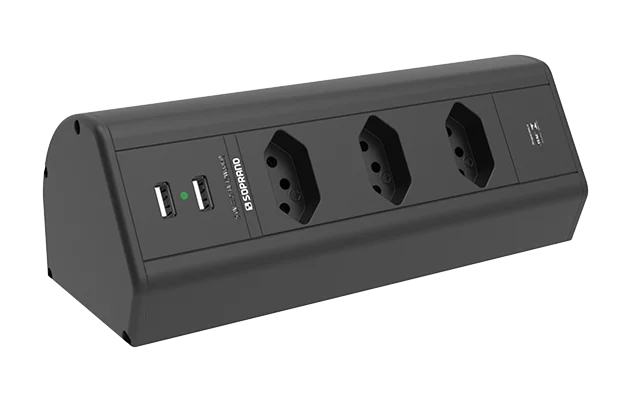 A Caixa de Tomadas de Sobrepor da Soprano, com acabamento preto e 3 módulos de energia + 2 módulos USB, é a solução ideal para integrar funcionalidade em mesas, balcões e superfícies de diferentes ambientes — como escritórios, cozinhas, home office e muito mais.