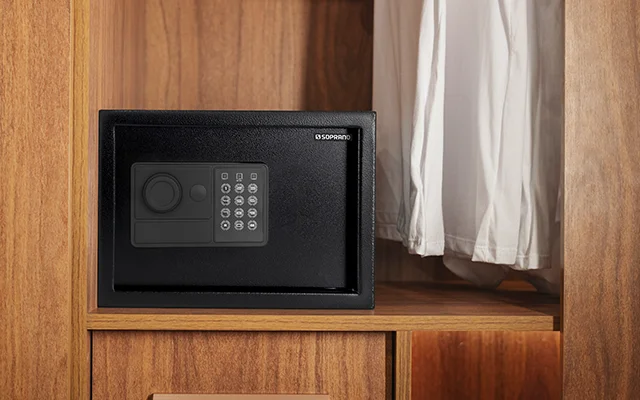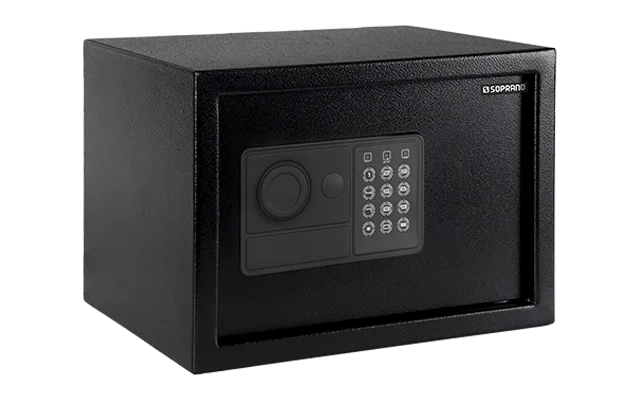 O cofre digital em acabamento preto da Soprano conta com capacidade de armazenamento de até 17,5 litros, indicado para guardar pequenos e grandes pertences com total segurança.