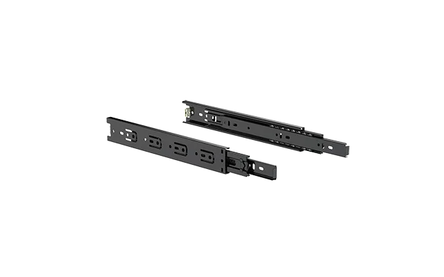 As corrediças telescópicas modelo larga de 45mm com acabamento preto da Soprano são robustas e proporcionam o deslizamento suave, silencioso e preciso, além de permitir a abertura total da gaveta.