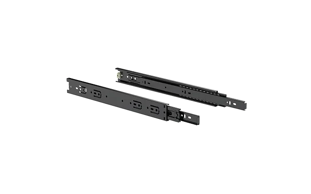 As corrediças telescópicas modelo larga de 45mm com acabamento preto da Soprano são robustas e proporcionam o deslizamento suave, silencioso e preciso, além de permitir a abertura total da gaveta.