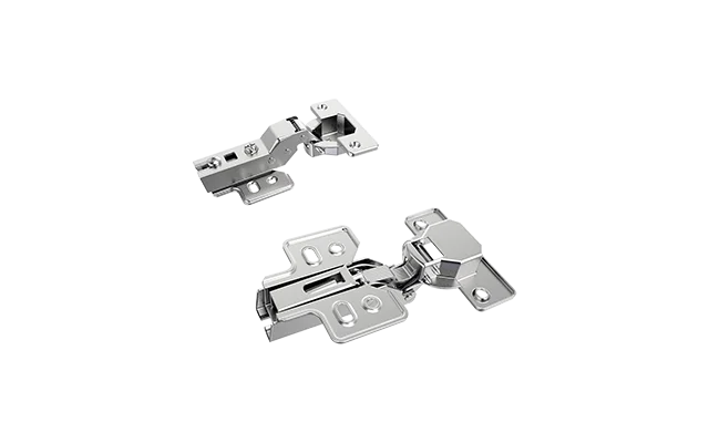 O modelo de dobradiça curva é mais indicado para portas semi-embutidas ou parcialmente sobrepostas à lateral do móvel, indicada principalmente quando o móvel possui uma sequência com mais de duas portas, e seu braço conta com regulagem de altura.