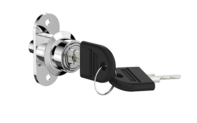 A FECHADURA PRESSÃO PARA PORTA DE CORRER modelo 1421 possui 24,5mm de comprimento do cilindro, chave escamoteável, rotação de 49º e 1 ponto de extração da chave.