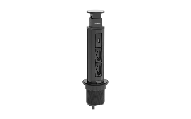 Quando fechada somente a base superior da torre de tomadas fica visível sobre o móvel, ao tocá-la a torre é impulsionada para fora do móvel, após é necessário puxá-la por inteiro e travá-la para iniciar o seu uso.
