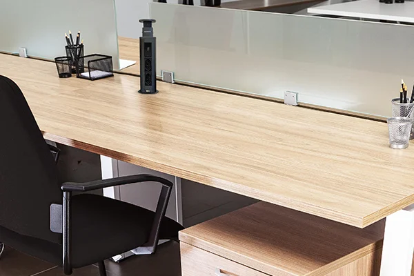 A torre de tomada embutir para móveis da Soprano é instalada em um furo passante de 60mm de diâmetro no móvel, ficando visível somente quando for utilizada.