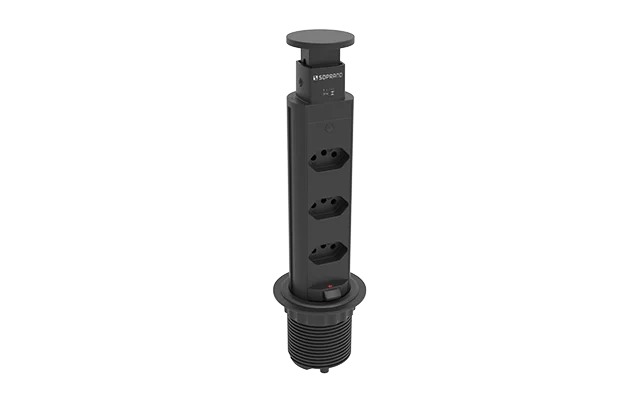 A Torre de Tomadas de Embutir da Soprano, com acabamento preto e 3 módulos de energia, é a solução ideal para integrar funcionalidade e estética em mesas, balcões e superfícies de diferentes ambientes — como escritórios, salas, cozinhas, home office e muito mais.