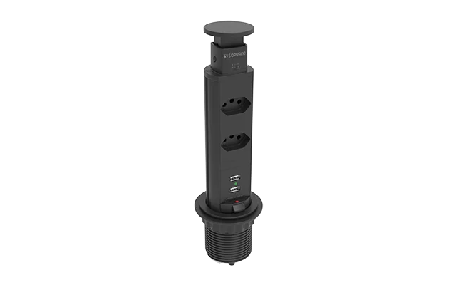 A Torre de Tomadas de Embutir da Soprano, com acabamento preto, conta com 2 módulos de energia e 2 módulos USB. É a solução ideal para integrar funcionalidade e estética em mesas, balcões e superfícies de diferentes ambientes — como escritórios, salas, cozinhas, home office e muito mais.
