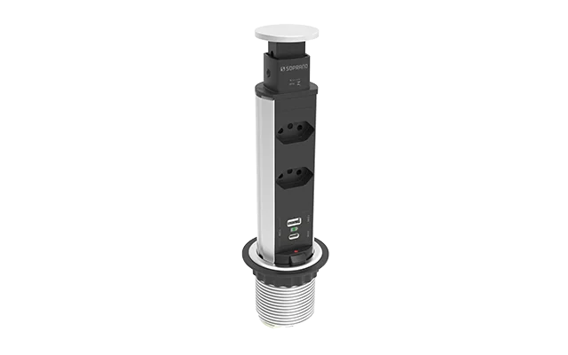 A Torre de Tomadas de Embutir da Soprano, com acabamento prata, conta com 2 módulos de energia, 2 módulos USB e 1 módulo USB tipo C, garantindo diversas possibilidades de conexão de aparelhos eletrônicos. É a solução ideal para integrar funcionalidade e estética em mesas, balcões e superfícies de diferentes ambientes — como escritórios, salas, cozinhas, home office e muito mais.