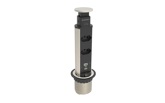 A Torre de Tomadas de Embutir da Soprano, com acabamento elegante em inox escovado, conta com 2 módulos de energia, 2 módulos USB e 1 módulo USB tipo C, garantindo diversas possibilidades de conexão de aparelhos eletrônicos. É a solução ideal para integrar funcionalidade e estética em mesas, balcões e superfícies de diferentes ambientes — como escritórios, salas, cozinhas, home office e muito mais.