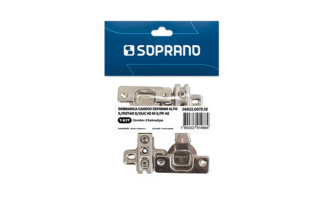 Dobradiça caneco 35x10mm braço alto sem pistão e sem clic da Soprano em embalagem autosserviço com 2 unidades.