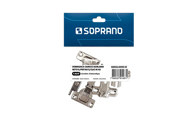 A dobradiça caneco 26x8,5mm com braço reto é mais indicada para portas sobrepostas à lateral do móvel.