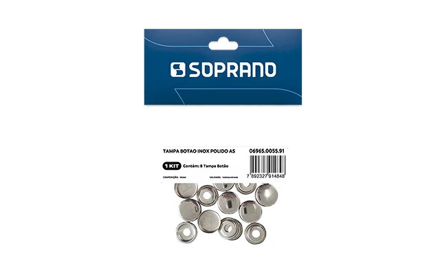 Tampa botão da Soprano em embalagem autosserviço com 8 unidades.