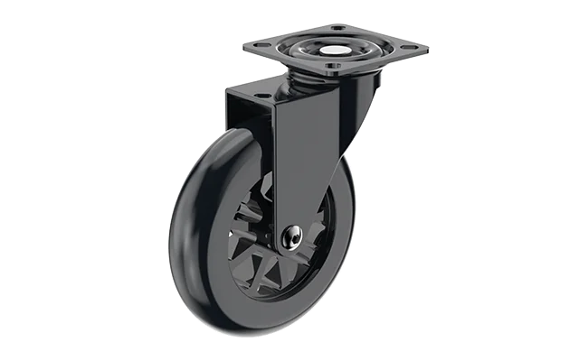 O rodízio gel 100mm sem freio chapa giratória em acabamento preto da Soprano proporciona uma movimentação muito mais suave e silenciosa aos móveis.