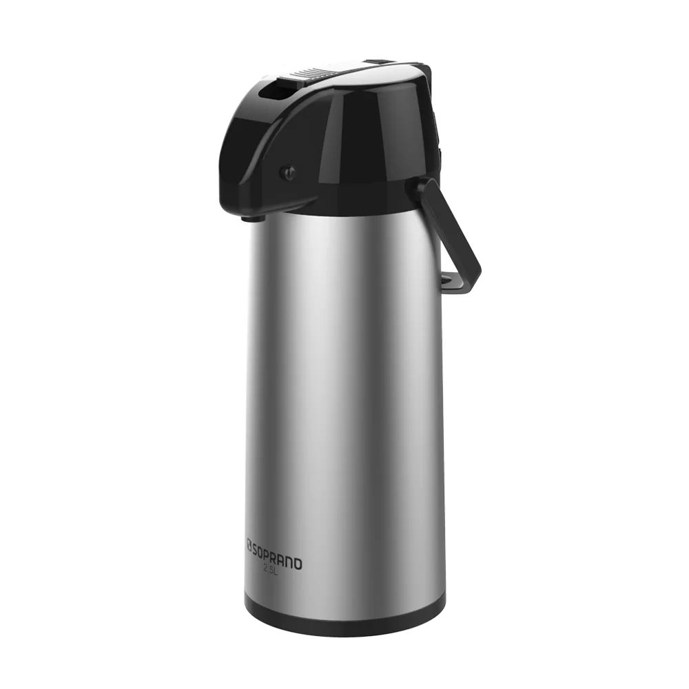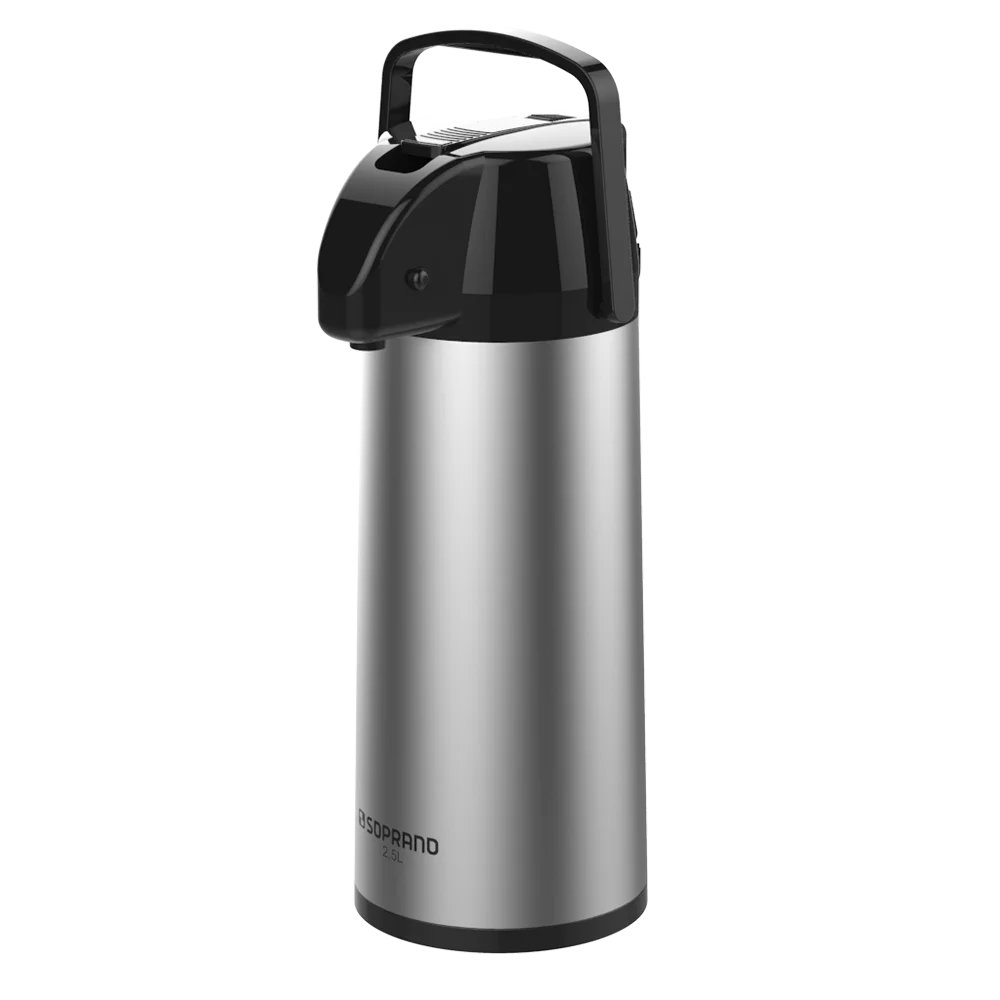 Garrafa Térmica 2,5 Litros de inox com sistema prático de servir por alavanca retrátil. Possui corpo escovado, verniz que evita manchas, tampa em polipropileno (PP), ampola de vidro, base giratória, alça para transporte e ótima eficiência ao servir, proporcionando até 400 ml em cada acionamento. Se seu cliente procura por uma garrafa térmica de grande volume, design diferenciado e eficiente, esta é a opção ideal! Garrafa térmica ainda possui embalagem individual para melhor exposição no seu PDV.