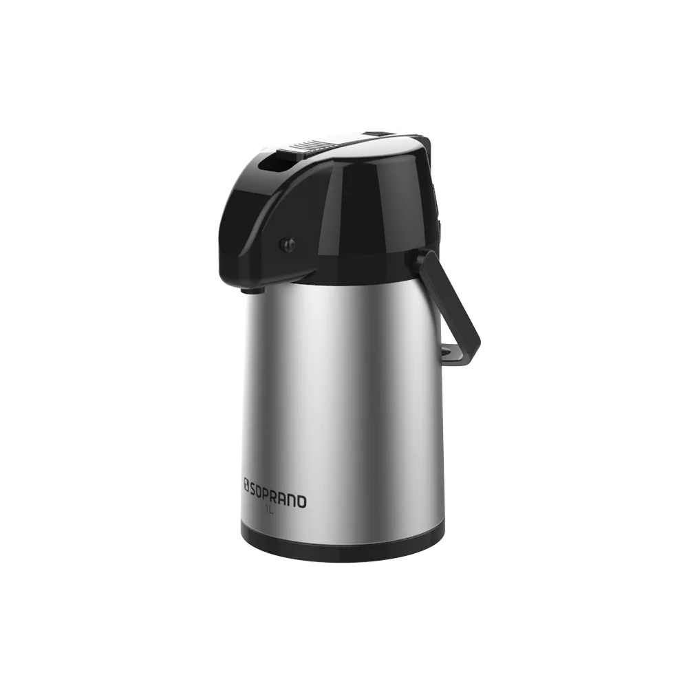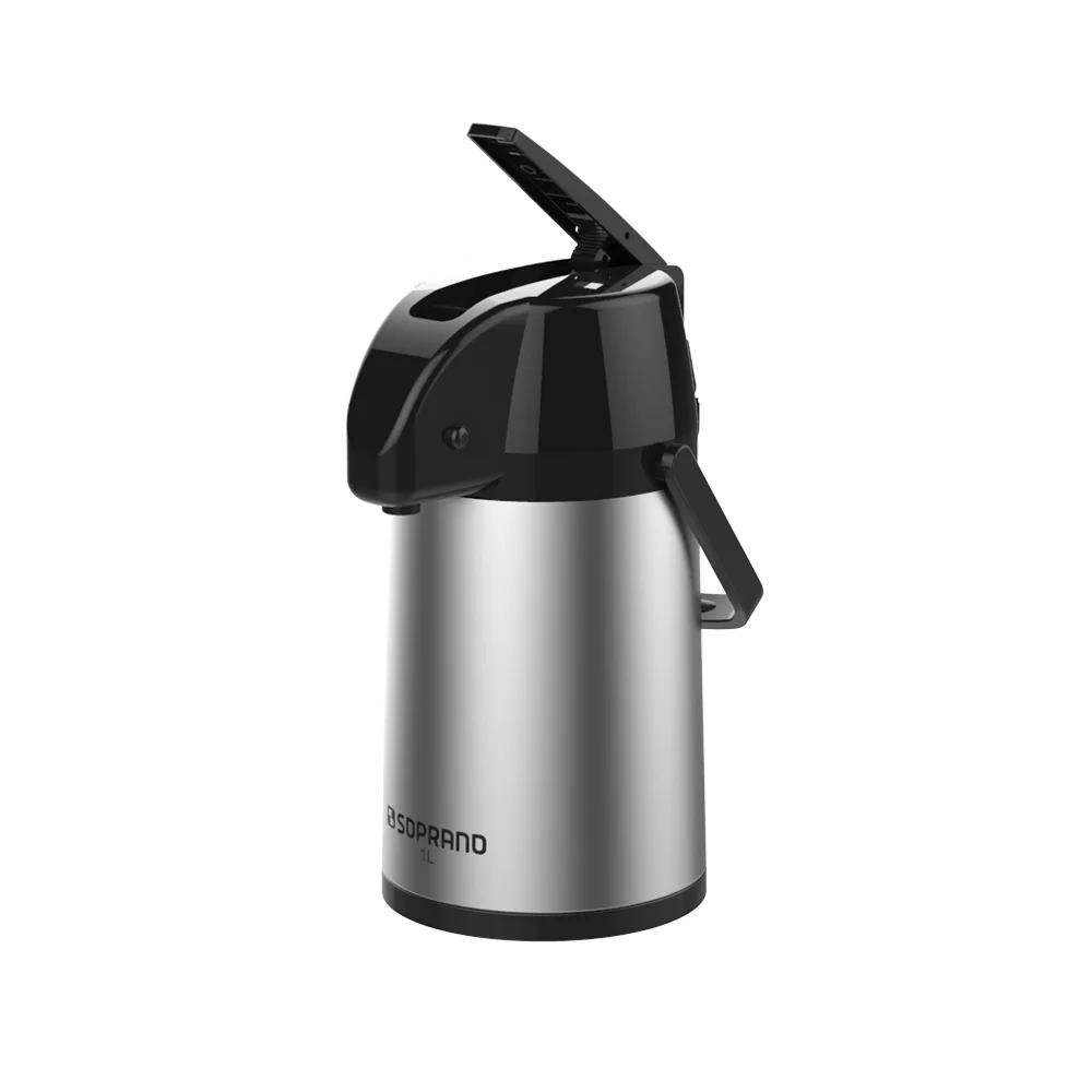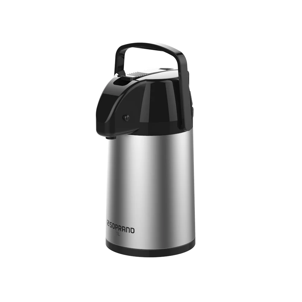 Garrafa Térmica 1 Litro de inox com sistema de servir por alavanca retrátil e ampola de vidro. Acabamento escovado, tampa em polipropileno (PP) e cobertura em verniz que evita manchas. Garrafa térmica serve até 400 ml por acionamento, possui alça para transporte e base giratória que facilita no momento de servir. A garrafa térmica ideal para seus clientes que buscam alta eficiência e um acabamento sofisticado. Este modelo ainda conta com uma embalagem individual comunicativa para auxiliar a venda no seu PDV.