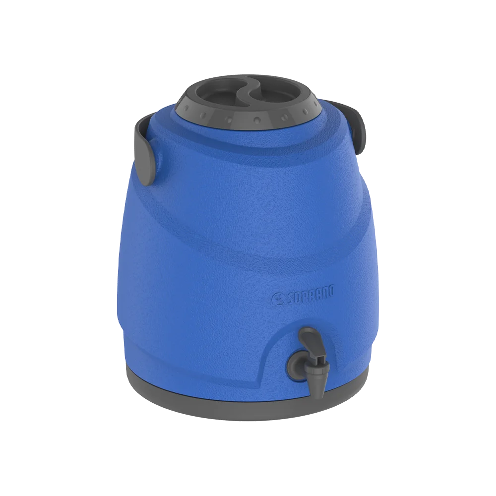 Botijão térmico 9 litros com design moderno, pés de apoio e porta copos retráteis. Botijão térmico com torneira prática para servir, alça de alta resistência para transporte e bocal largo para facilitar o abastecimento de gelo ou líquidos quentes e frios. Este modelo de Botijão térmico possui isolamento em poliuretano (PU) e é livre de Bisfenol (BPA Free). A opção ideal para os seus clientes que buscam por praticidade e durabilidade.
