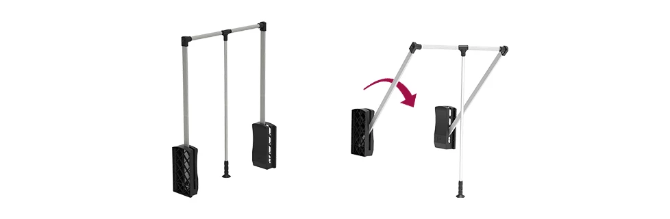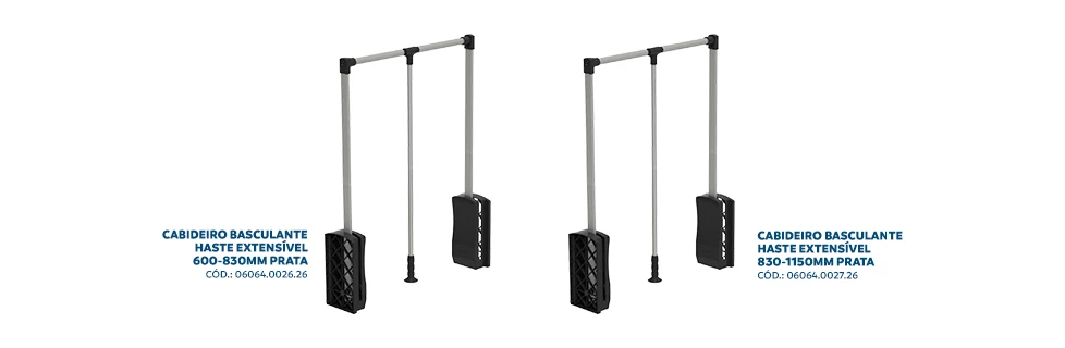 Os cabideiros basculantes da Soprano estão disponíveis em duas opções de hastes extensíveis, possibilitando a aplicação de 600 mm a 830 mm e de 830 mm a 1.150 mm.