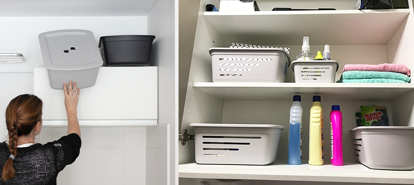 Organizá-los é mais simples do que parece. O primeiro passo é tirar os itens das embalagens, para ocupar menos espaço. Depois, utilize cestos para separar os produtos por categoria. Por exemplo: uma caixinha para artigos de limpeza de chão, outra para lavar roupas, e por aí vai.