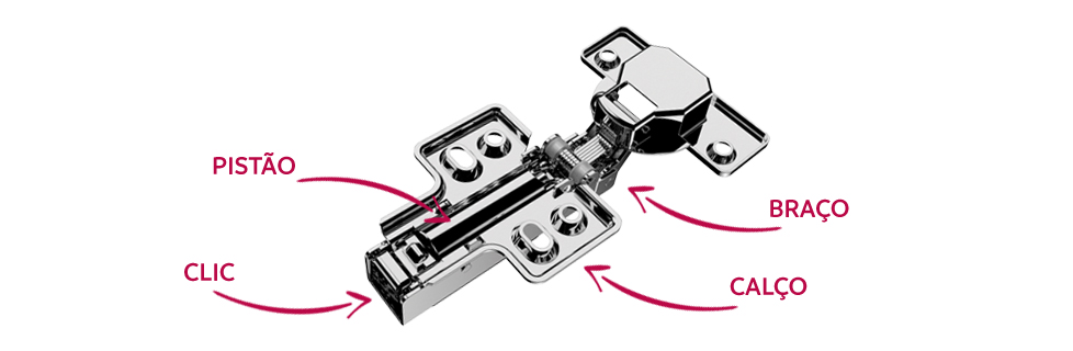 As dobradiças 35mm são ferragens compostas basicamente por três partes: corpo, caneco e calço.