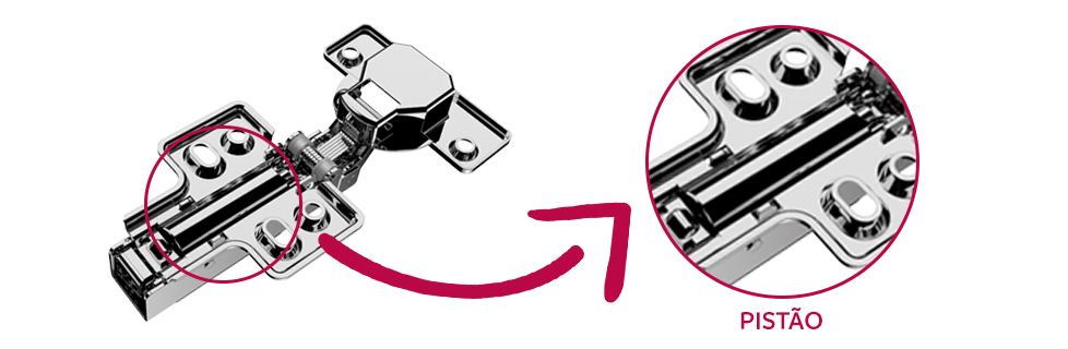 Outra característica do componente é que há duas versões: com pistão ou sem pistão. Os pistões também são chamados de amortecedores e exercem essa função de suavizar o fechamento da porta do móvel, levando ainda mais sofisticação para a casa do seu cliente.