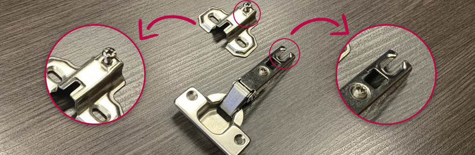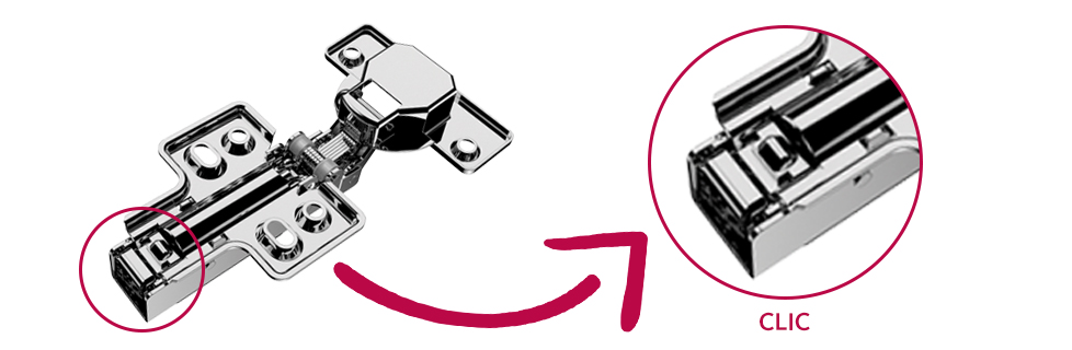 O sistema mais tradicional é o click, que se encaixa o corpo da dobradiça no seu calço, que torna mais fácil a montagem e desmontagem da porta no móvel.