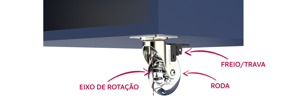 Rodízios são pequenas rodas instaladas sob os móveis, permitindo que sejam movimentados com facilidade e segurança, sem danificar o piso.