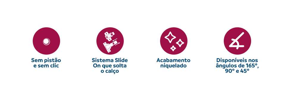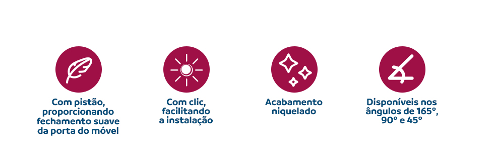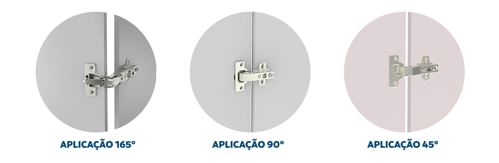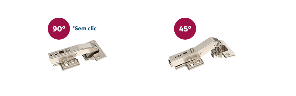 As Dobradiças Caneco 35mm Ângulos Especiais são indicadas para aplicação em móveis que requerem um ângulo de abertura da porta diferente do habitual, como por exemplo, móveis que são aplicados nos cantos dos ambientes visando a otimização do espaço em cômodos menores.