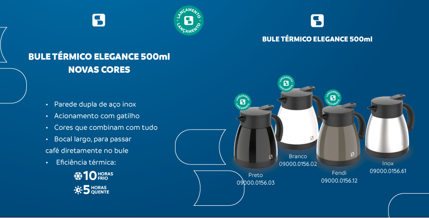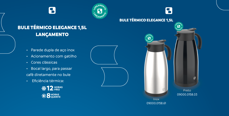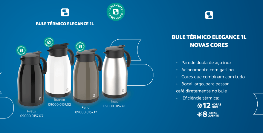 Além de toda a funcionalidade, os Bules Elegance são verdadeiros protagonistas no ponto de venda. Seu visual moderno e sofisticado atrai os olhares dos clientes, impulsionando a decisão de compra. São produtos que despertam desejo e transmitem qualidade, sendo ideais para quem quer oferecer um diferencial competitivo na loja. Os Bules Térmicos Elegance chegaram para transformar o seu mix de produtos e atrair mais clientes para o seu ponto de venda. Aposte neste lançamento e garanta um produto que une beleza, eficiência e alta vendabilidade!