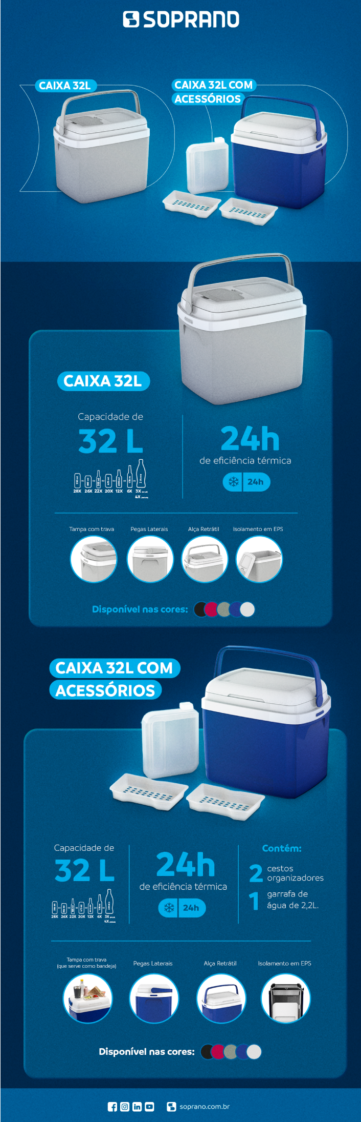 A Soprano está agregando um novo modelo à sua linha Tropical de caixas térmicas: a caixa térmica de 22 litros. Esta nova caixa completa uma linha já bem estabelecida, que inclui modelos de 5, 12, 28, 32 e 50 litros.