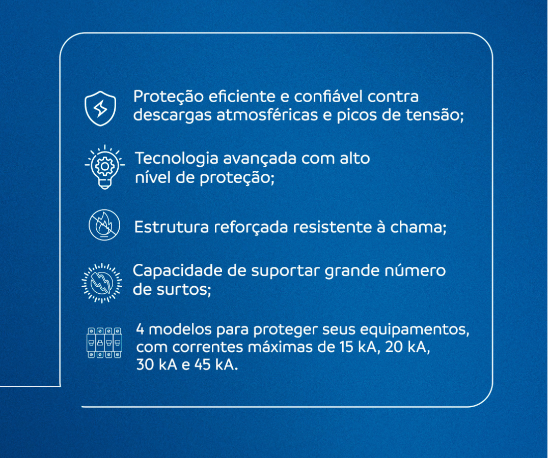 - Disponível em quatro modelos, com correntes máximas de descarga de 15 kA, 20 kA, 30 kA e 45 kA;