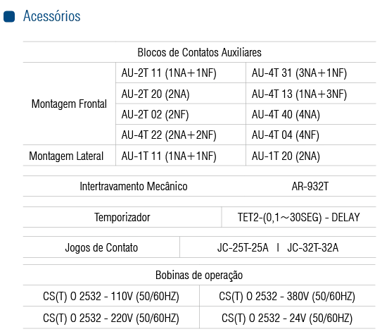 A linha de Contatores e Relés Térmicos de Sobrecarga CS(T) tem uso de forma integrada, sendo produtos altamente seguros e em total conformidade com a norma NBR IEC 60947-4.Formada por Contatores de potência de 9A até 800A e Relés de Sobrecarga além de um conjunto de AcessóriosOpcionais.