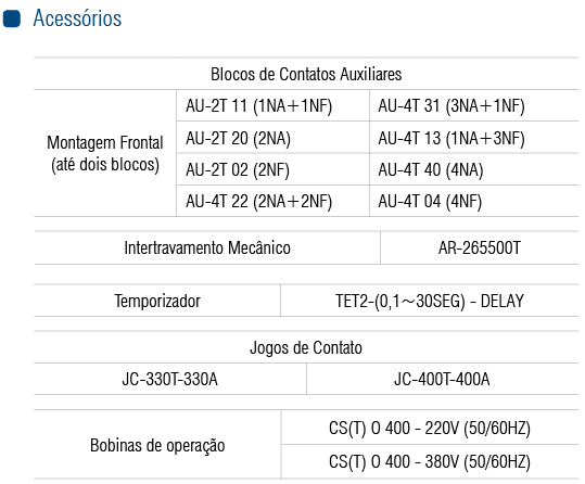 A linha de Contatores e Relés Térmicos de Sobrecarga CS(T) tem uso de forma integrada, sendo produtos altamente seguros e em total conformidade com a norma NBR IEC 60947-4.Formada por Contatores de potência de 9A até 800A e Relés de Sobrecarga além de um conjunto de AcessóriosOpcionais.