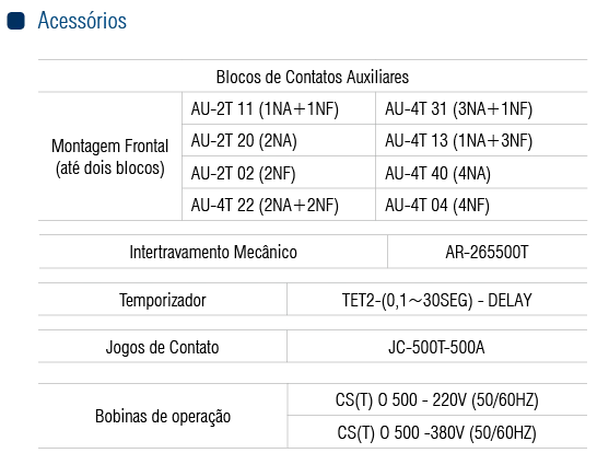A linha de Contatores e Relés Térmicos de Sobrecarga CS(T) tem uso de forma integrada, sendo produtos altamente seguros e em total conformidade com a norma NBR IEC 60947-4.Formada por Contatores de potência de 9A até 800A e Relés de Sobrecarga além de um conjunto de AcessóriosOpcionais.