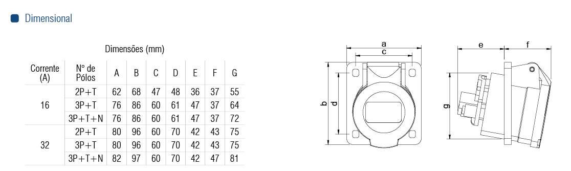 Número de pólos: 3, 4 e 5 pólos (2P+T, 3P+T e 3P+T+N);