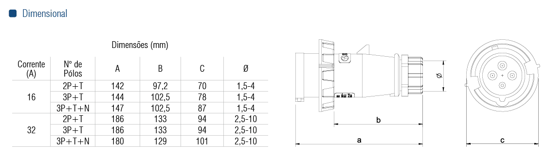 Construção: conforme norma NBR IEC 60309-1 e NBR IEC 60309-2.