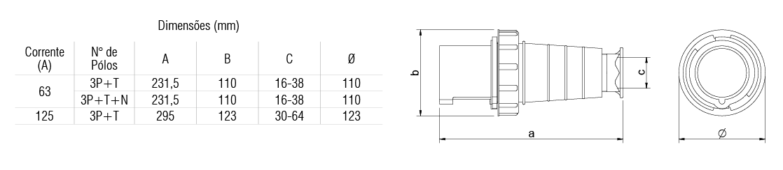 Construção: conforme norma NBR IEC 60309-1 e NBR IEC 60309-2.