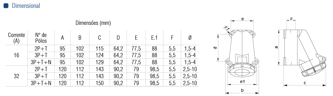 Número de pólos: 3, 4 e 5 pólos (2P+T, 3P+T e 3P+T+N);